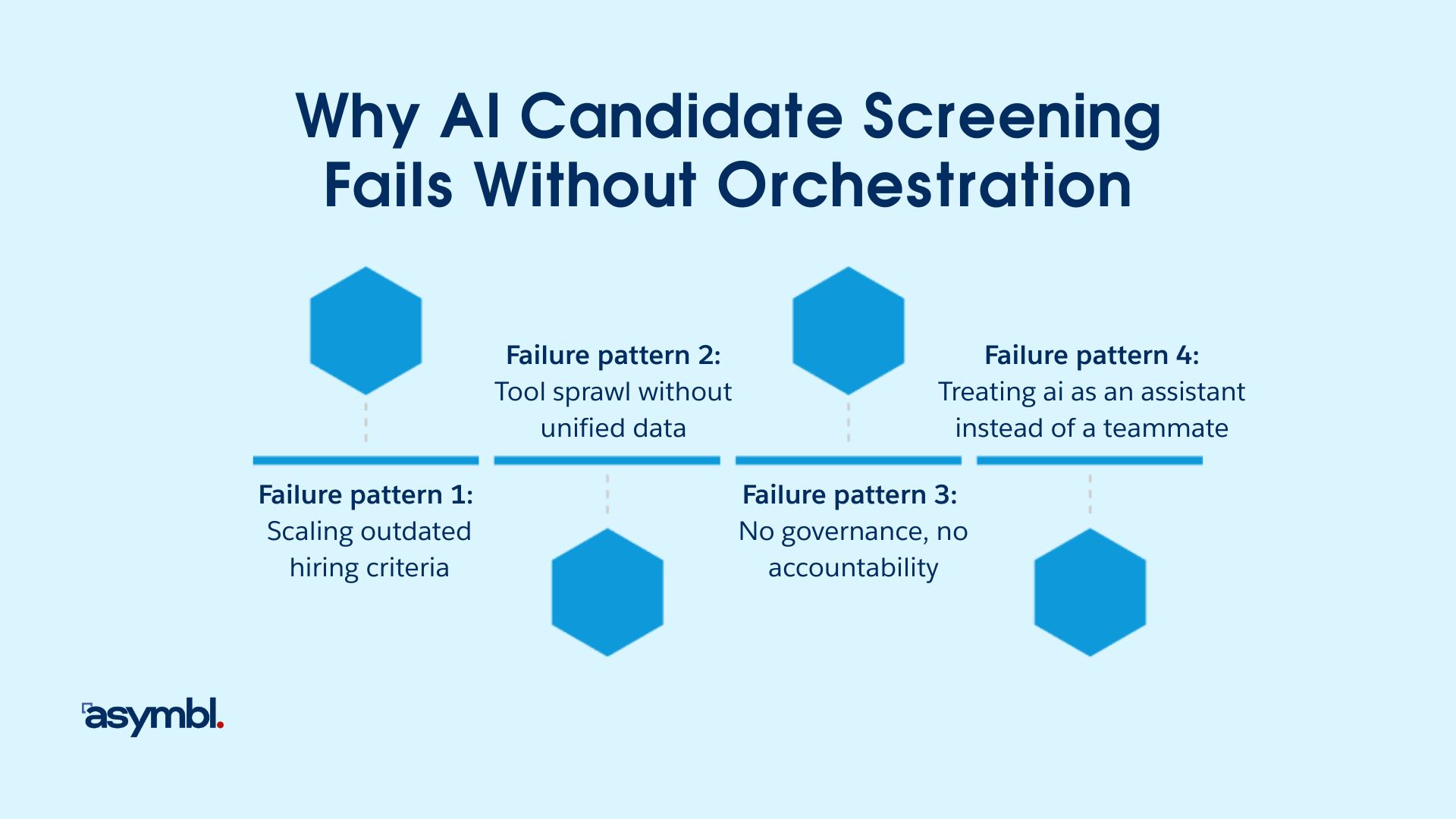 Failure usually stems from fragmented data, outdated hiring criteria, weak governance, and unclear decision ownership. AI amplifies whatever system it operates within. If the foundation lacks alignment and auditability, screening becomes inconsistent, opaque, and difficult to defend
