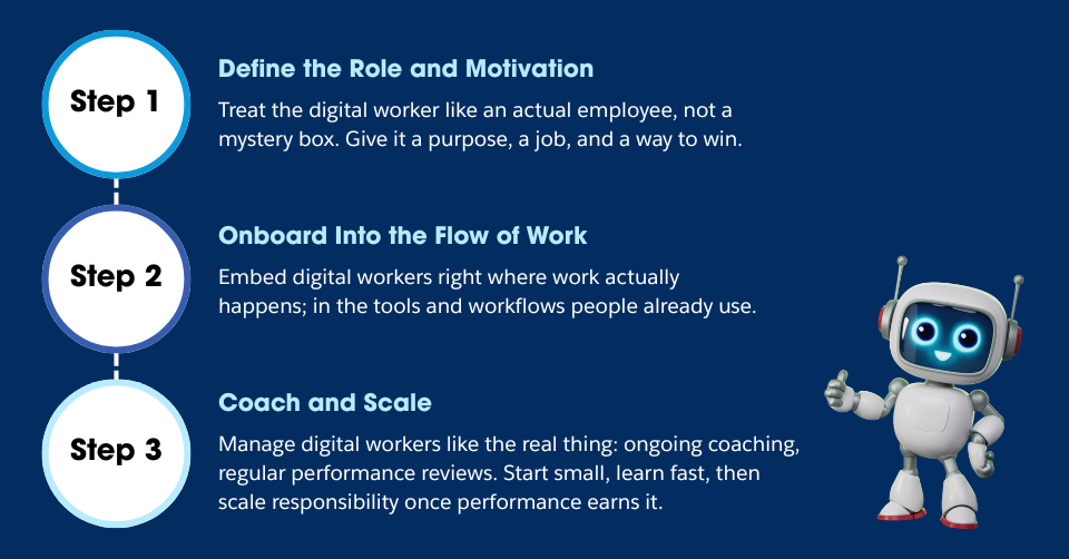 Digital workers are not the beginning of AI adoption. They’re the point where AI finally fits into how work actually gets done. At Asymbl, we help organizations reach this point using our three-step playbook: Define the Roles and Motivation, Onboard into the Flow of Work, Coach and Scale.