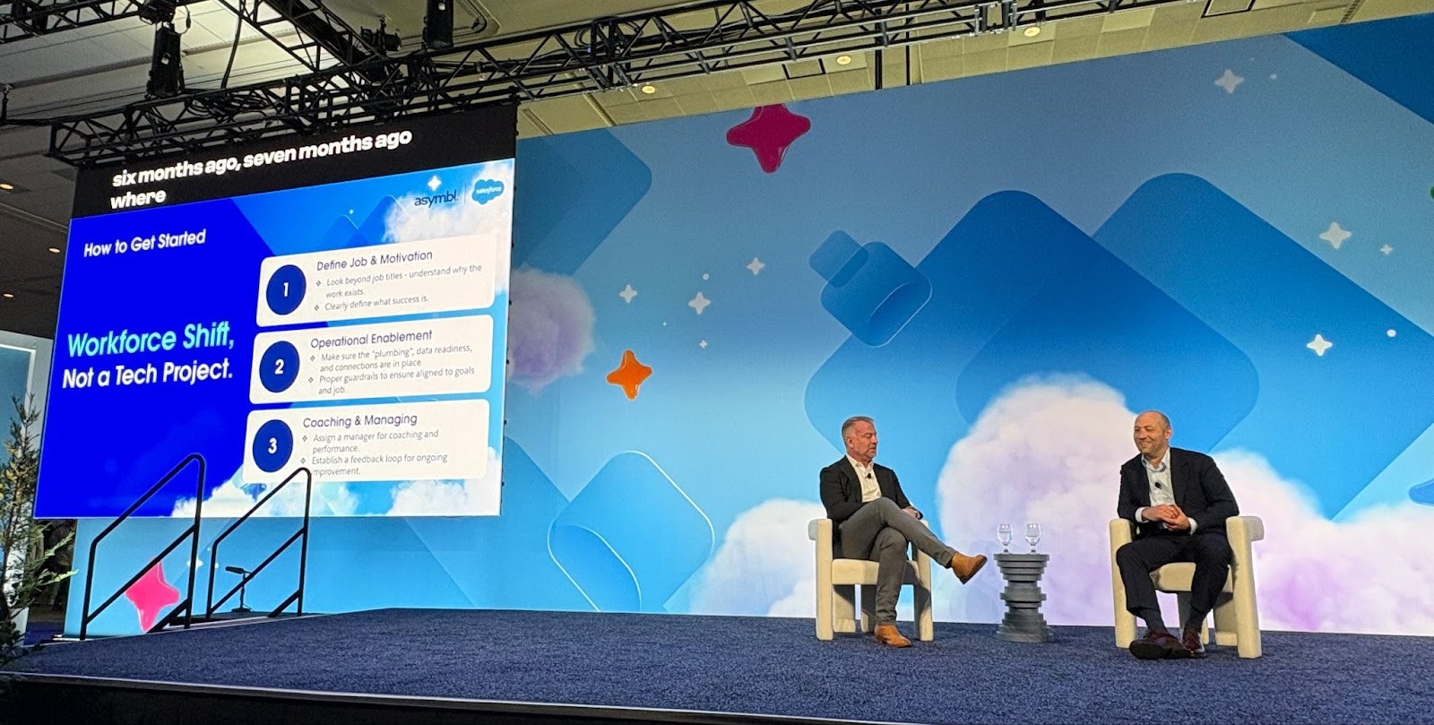 We recently discussed this very transformation, how to assemble the hybrid workforce of the future, on stage at Salesforce’s annual Dreamforce conference, alongside Mark Grimwood, SVP of Global Sales & Distribution Recruiting and Global Talent Attraction. Together, we explored what it takes to blend human and digital workers to achieve real business outcomes, not theoretical promise.