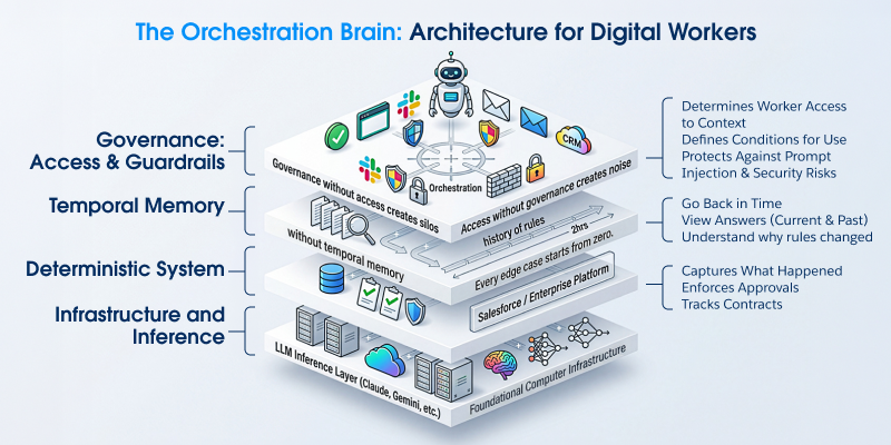 Layer 3, Governance: The framework that determines which digital workers access which context under what conditions. This matters for security; the risk of prompt injection into a poorly governed memory layer is real, as organizations running external-facing agents have already discovered. But governance is equally a design principle. Governance without access creates silos. Access without governance creates noise. Getting both right is where orchestration happens.
