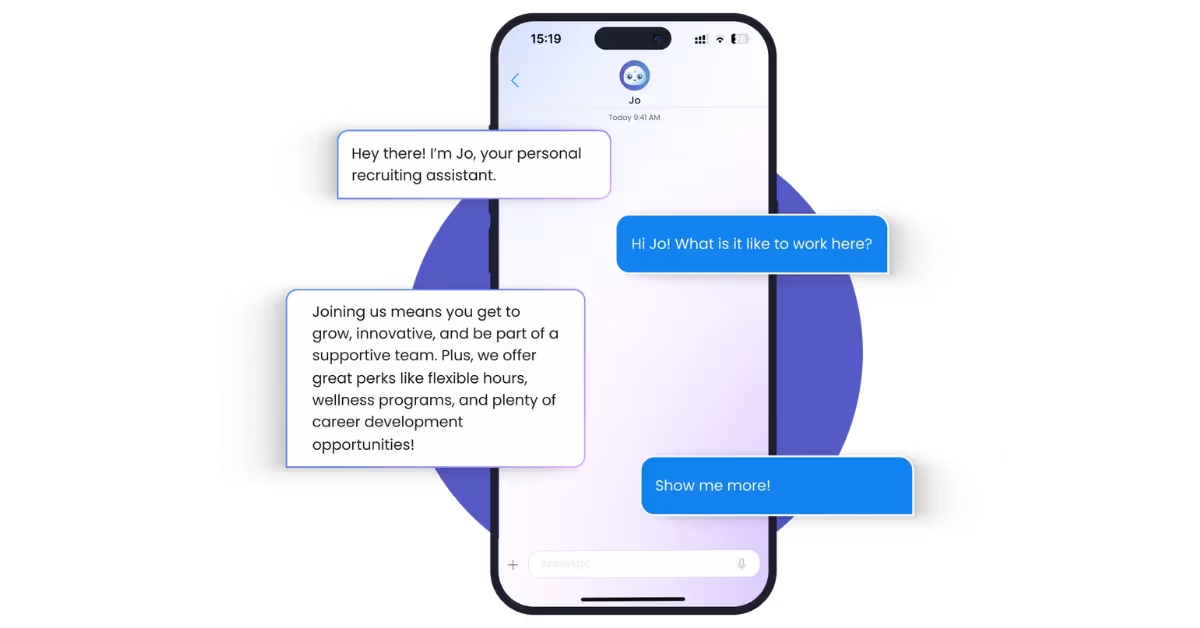 - Conversational AI: Automate real-time engagement with chatbots that offer job recommendations, answer questions, and facilitate scheduling.