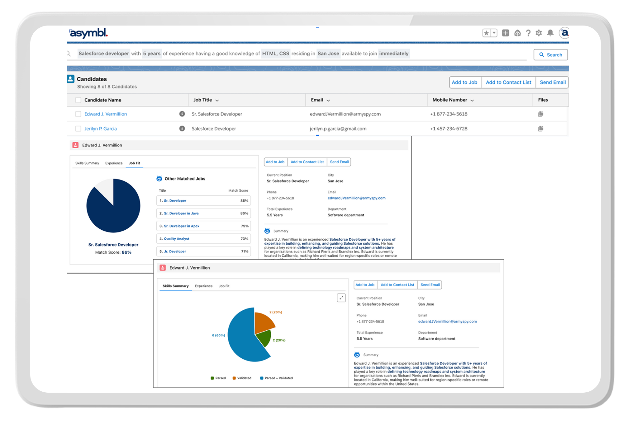 Salesforce-based foundation that unifies ATS, AI search, and engagement for a connected 360 view.